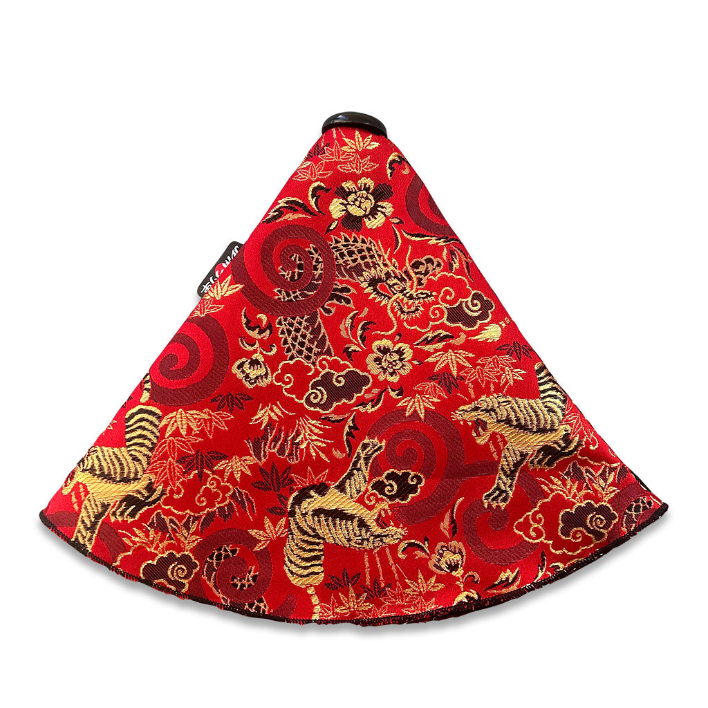 赤地に金色の虎と龍が織り込まれた迫力あるデザインで、存在感あふれる逸品となっています。
